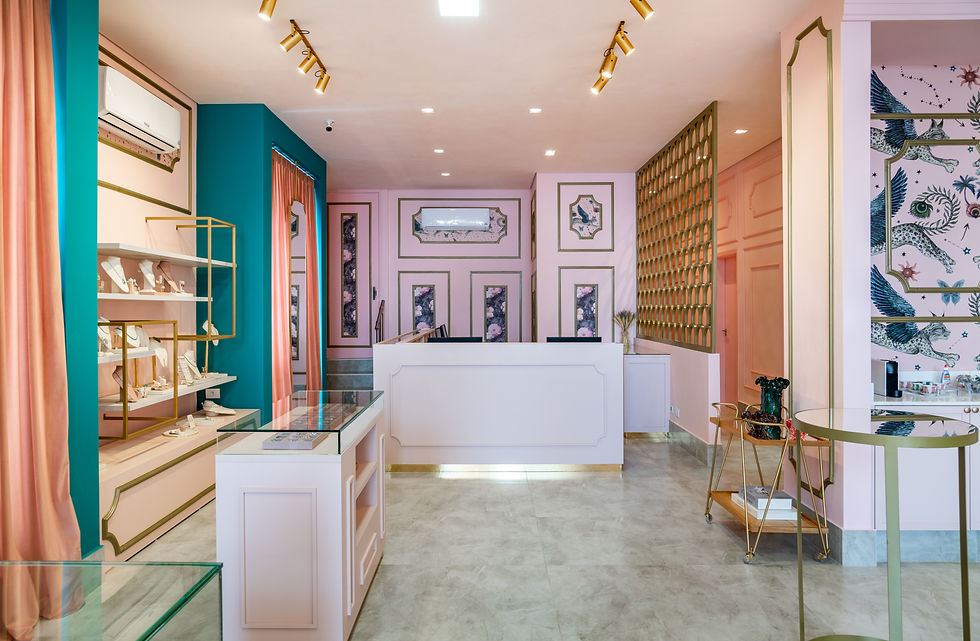 Neuroarquitetura e identidade da marca se fundem para criar uma experiência de varejo que celebra a união do clássico com o fashion. A estratégia central residiu em traduzir a personalidade criativa e ousada da cliente em um ambiente sensorialmente envolvente. A paleta de cores é o ponto de partida: o rosa pálido domina as paredes e o mobiliário principal, uma cor que evoca feminilidade e delicadeza, intencionalmente contrastada pelo azul turquesa profundo em volumes específicos, injetando um toque de modernidade e atitude que reflete a dualidade da marca.